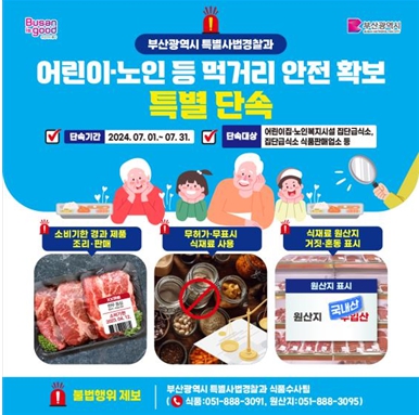 박형준 시장은 “여름철 무더위에 취약해 건강관리에 특별한 관심이 필요한 어린이와 노인의 먹거리 안전을 확보하고자 이번 단속을 기획했다”라며, “우리시는 이번 단속을 통해 시민의 건강에 위협이 될 수 있는 식품·급식과 관련한 불법행위를 엄정 조치할 계획이다”라고 밝혔다.