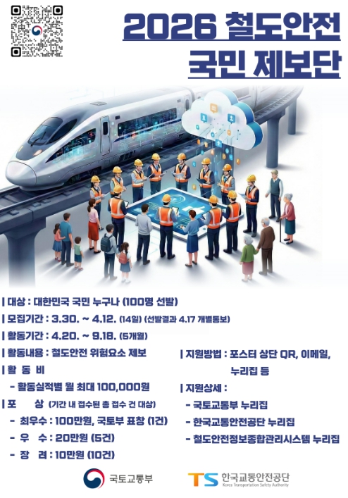 [뉴스서치] 국토교통부는 철도 이용과정에서 발생할 수 있는 위험요인을 국민의 시선에서 발굴‧개선하고, 전국 철도안전 수준을 제고하기 위해한국교통안전공단(이사장 정용식)과 함께 3월 30일부터 ‘2026 철도안전 국민제보단’을 모집한다.