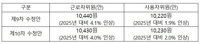 수정안 제출 요구에 동의하지 못한 민주노총 추천 근로자위원(4명)이 퇴장한 가운데 진행된 회의에서 노·사는 제9차, 제10차 수정안을 제출하고 합의 도출을 위한 노력을 이어갔다.
