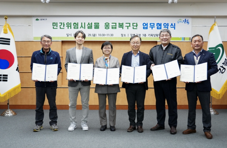 협약에 따라 5개 업체는 이날부터 강북구에서 시행하고 있는 건축공사 준공일까지 각종 재해로 인해 공중 이용에 불편을 초래하거나 추가 피해가 발생될 것으로 예상되는 현장 등을 신속하게 복구하게 된다. 주요 복구사항은 위험시설물 응급 보강, 건축물 붕괴 시 추가피해 방지, 집중호우 시 진흙 및 쓰레기 제거, 양수기 작업, 빗물제거 등이다.