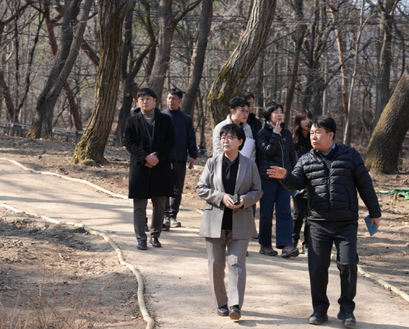 ▲ 이순희 강북구청장이 지난 21일 북한산 체험숲속 쉼터 개장 전 현장을 찾아 산책로를 점검하고 있다 |