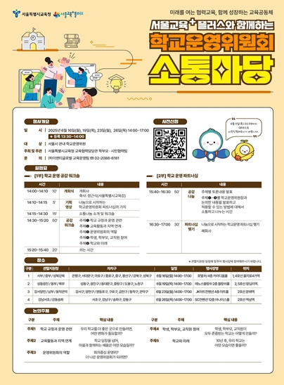 먼저, 학교운영위원회의 책무성과 실질적 역할을 강화하고 학교 간 협력의 장을 마련하기 위한 『2025 서울교육+플러스와 함께하는 학교운영위원회 소통마당』을 최초 개최한다.
