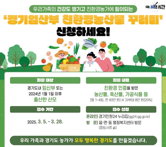 [뉴스서치] 경기도가 임산부에 친환경농산물 꾸러미를 지원하는 ‘경기임산부 친환경농산물 지원’ 대상자를 3월 5일부터 28일까지 모집한다.