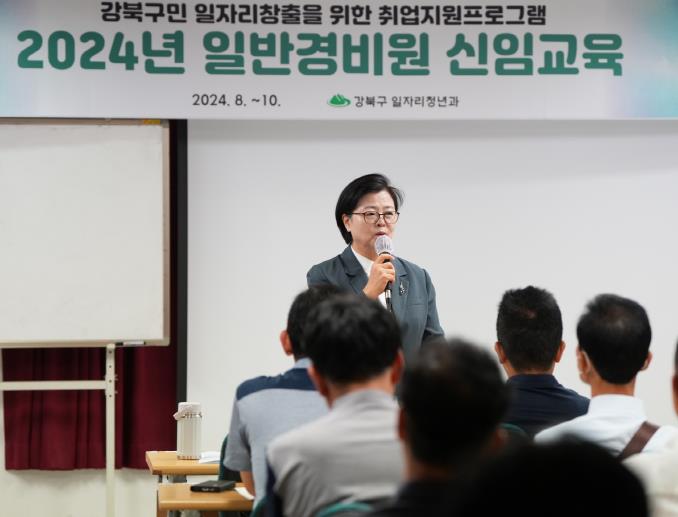 | ▲ 이순희 강북구청장이 일반경비원 신입교육 장소에 방문해 인사말을 전하고 있다. |