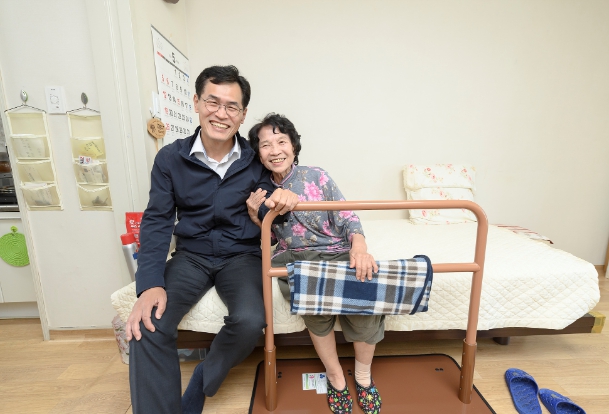 ▲ 지난 달 어르신 안심 주거환경 개선사업 대상 가구를 직접 방문해 낙상예방물품(침대) 설치현황을 점검한 이기재 양천구청장 |