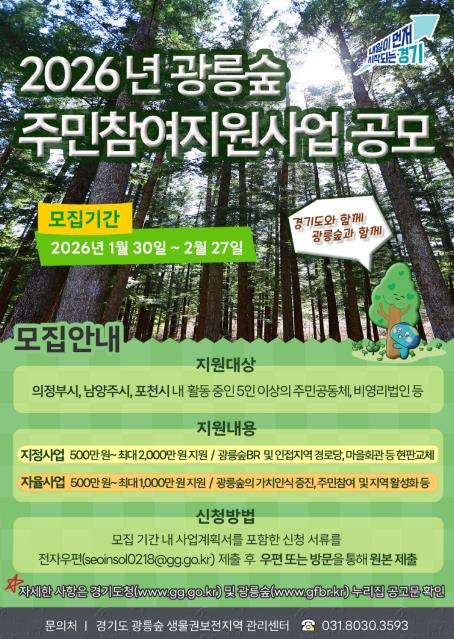 [뉴스서치] 경기도가 광릉숲 생물권보전지역 활성화를 위해 2026년 광릉숲 주민참여지원사업 참여자를 모집한다.