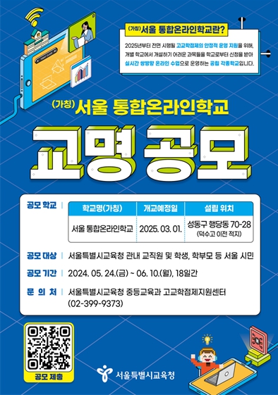[뉴스서치] 서울특별시교육청은 2025년 3월에 개교 예정인 (가칭)서울 통합온라인학교(이하 서울온라인학교)의 교명 공모를 5월 24일부터 6월 10일까지 18일간 실시한다.