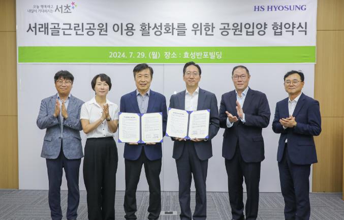 이날 양 기관 대표로 협약식에 참석한 전성수 서초구청장과 안성훈 HS효성 대표이사는 공원 입양 협약서에 서명함과 함께 기념식수 등 행사를 진행하였다.