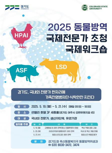 이강영 경기도 축산동물복지국장은 “이번 워크숍은 국제적 동물방역 네트워크를 강화하고, 선진 방역기술 도입과 체계적인 대응 시스템 구축을 위한 소중한 계기가 될 것”이라며 “축산업계와 방역 전문가뿐 아니라 가축질병과 식품안전에 관심 있는 누구나 참여 가능한 만큼, 많은 관심과 참여를 부탁드린다”고 밝혔다.