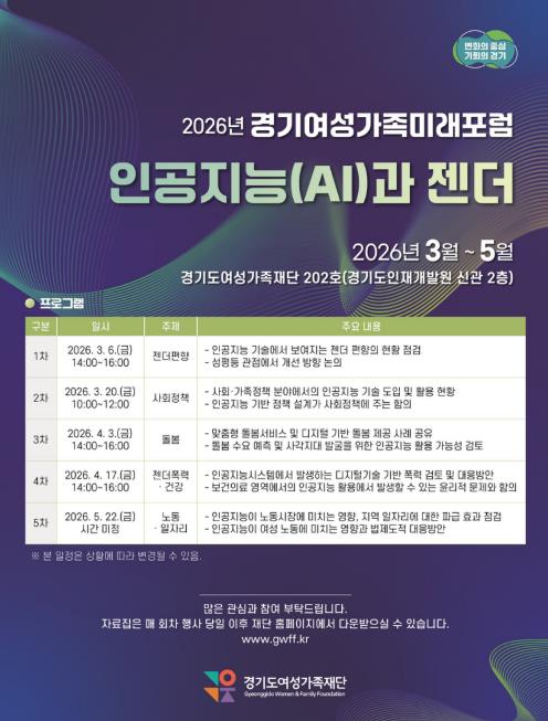 총 5회에 걸쳐 진행되는 포럼은 젠더편향(1차), 사회정책(2차), 돌봄(3차), 젠더폭력·건강(4차), 노동·일자리(5차) 등을 주제로 전문가 발표와 토론 방식으로 운영된다. 포럼 결과는 후속 정책 연구로 연계함으로써 경기도의 중장기 성평등·가족정책 의제를 발굴할 예정이다.