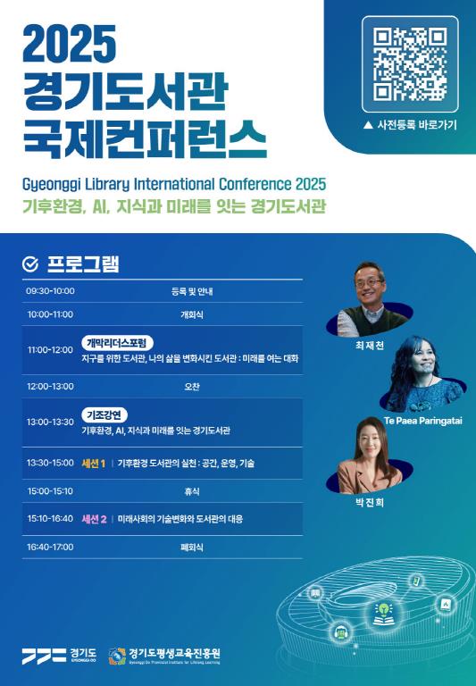 [뉴스서치] 경기도와 경기도평생교육진흥원은 오는 23일 수원컨벤션센터 컨벤션홀3에서 ‘기후환경, AI, 지식과 미래를 잇는 도서관’을 주제로 ‘2025 경기도서관 국제콘퍼런스’를 개최한다.