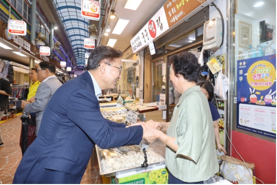 ▲ 지난해 은행나무시장 행사에서 유성훈 구청장이 상인과 인사하고 있다 |
