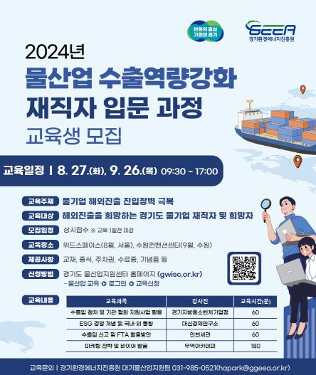 경기도 물기업 재직자 라면 누구나 신청할 수 있고, 교육내용은 수출입 관련 기관 및 협회 지원사업 활용과 마케팅 전략, ESG경영 및 FTA 활용방안 등 해외진출을 위한 실무 능력 중심으로 구성됐다.