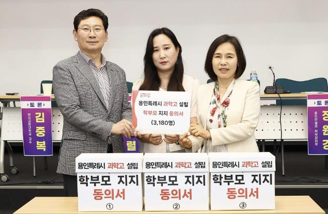 토론회에 앞서 정원경 한얼초학부모회장은 지역 내 학부모들이 자발적으로 과학고등학교 유치를 염원하는 마음을 담아 서명한 동의서 3180장을 이상일 시장과 김희정 교육장에게 전달했다.