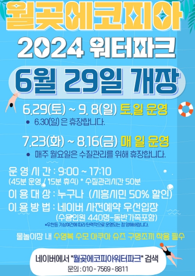 월곶에코피아 워터파크는 도심 속에서 자연친화적인 환경과 함께 물놀이를 할 수 있는 야외 물놀이 시설로, 오는 7월 6일 개장하여 9월 8일까지 운영될 예정이다. 정식 개장에 앞서 6월 29일 하루는 시범운영 된다.