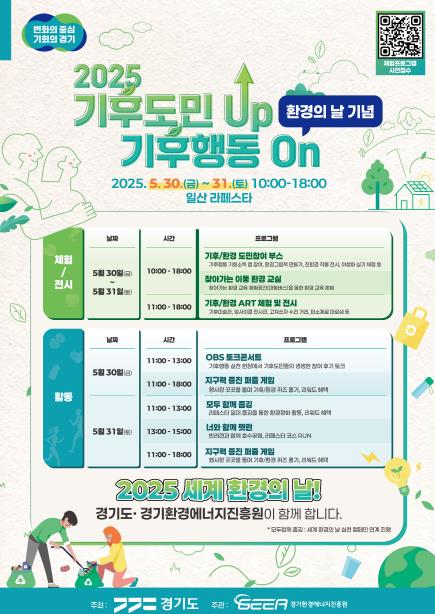[뉴스서치] 경기도와 경기환경에너지진흥원은 ‘2025 세계 환경의 날(6월 5일)’을 기념해 오는 5월 30일부터 31일까지 고양시 일산 라페스타에서 ‘2025 기후도민 UP, 기후행동 ON’ 현장 체험행사를 개최한다.