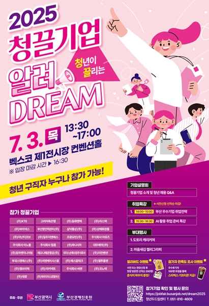 한편, 오늘(3일) 오후 1시 30분 벡스코 컨벤션홀 2층에서는 부산의 우수기업 소개와 함께 맞춤형 채용정보 제공을 위한 '청끌기업 알려드림(DREAM)'이 함께 열린다.