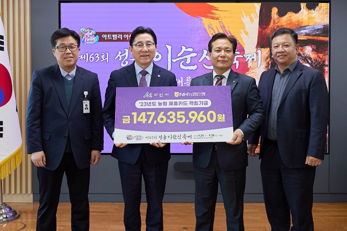 이날 전달받은 제휴카드 기금은 아산시복지카드, 아산사랑카드 등의 2023년도 이용 실적에 따라 NH농협에서 적립한 것으로 아산시 공익사업에 활용될 계획이다.