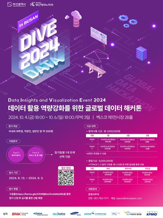 [뉴스서치] 부산시는 올해 처음으로 개최하는 '세계적(글로벌) 데이터 해커톤 대회' '다이브(DIVE) 2024'의 참가자를 오늘(13일)부터 9월 3일까지 모집한다고 밝혔다.