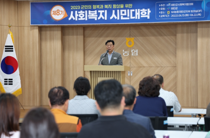 | ▲ 지난해 NH농협 태안군지부 회의실에서 진행된 제8기 사회복지 시민대학 모습(2023. 6. 13.). |