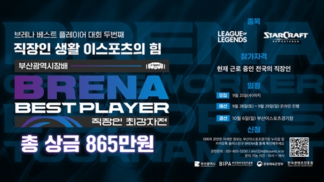 ‘브레나 베스트 플레이어’ 대회는 아마추어 이스포츠 최고 실력자를 선발하는 부산지역 대표 이스포츠대회로, 지난 7월 개최한 ▲부․울․경 청소년 최강자전에 이어 ▲전국 직장인 최강자전 ▲아마추어 종합 최강자전으로 총 3회 개최될 예정이다.