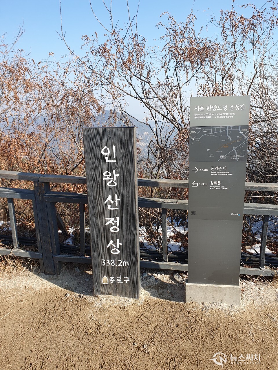 급경사의 인왕산 순성길을 따라 오르막 산행을 하였고 오후 12시 11분 ‘기차바위 갈림길’을 통과한 뒤 계속 걸어 오후 12시 19분 인왕산 정상에 도착하였다. ‘인왕산(仁王山)’은 해발 338m 높이로 ‘좌청룡 우백호 남주작 북현무’에서 ‘우백호’를 담당하는 산이다.