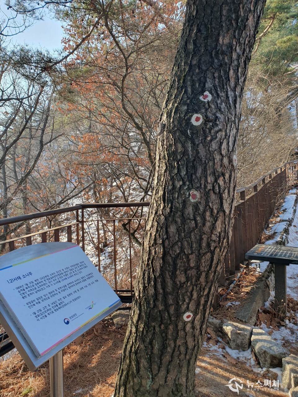 1.21.사태 소나무. 한양도성길 백악구간 중 백악마루에서 청운대로 내려가는 길에 1·21 사태 소나무가 있다. 수령이 약 200년 정도 된 나무인데 15발의 총탄 자국이 남아 있다. 이 총탄 자국은 1968년 1월 21일, 청와대를 습격하려 침투한 북한 특수부대원들과 우리 군경이 교전한 흔적이다. 이곳에서 성 바깥을 바라보면 북한산과 백악 사이에 자리 잡은 평창동이 한눈에 조망되는데, ‘평창동’이라는 지명은 선혜청의 부속 창고인 평창(平倉)이 있었던 것에서 유래되었다.