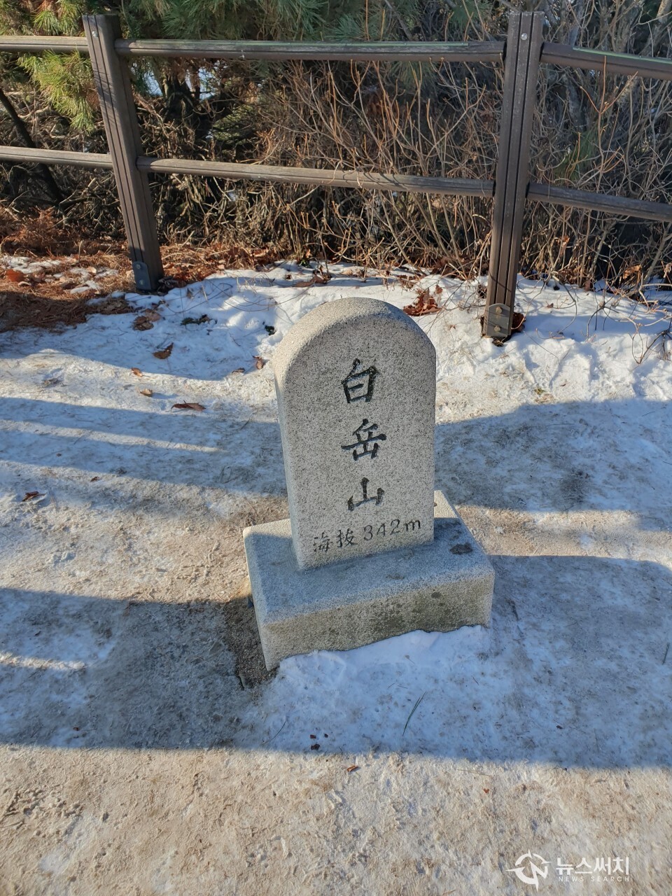 백악산 정상석. ‘백악산(白岳山)’은 ‘북악산(北岳山)’이라고도 하는데 해발 342m 높이로 경북궁의 주산(主山)이며 풍수지리적으로 매우 중요한 한양의 진산(鎭山)이다. 한양도성 성을 처음 쌓을 때 공사 구간을 97개로 나눴는데 각 구간의 이름을 천자문 순서에 따라 붙였다. 시작 구간을 ‘천(天)’, 끝나는 구간을 ‘조(弔)’라고 하였는데, 백악산 정상이 바로 ‘천(天)’ 구간에 해당된다.