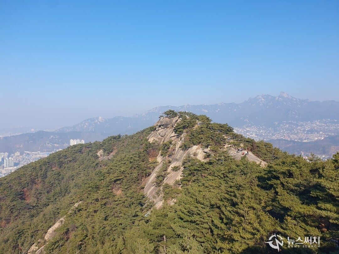 ‘백악산(白岳山)’은 ‘북악산(北岳山)’이라고도 하는데 해발 342m 높이로 경북궁의 주산(主山)이며 풍수지리적으로 매우 중요한 한양의 진산(鎭山)이다. 백악산 남쪽에 경복궁과 청와대가 자리잡고 있으며, 백악산 북쪽으로 멀리 북한산 능선이 보이고 그 아래 평창동, 부암동 마을이 한눈에 조망된다.