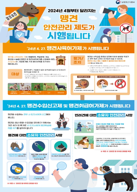 둘째, 맹견 개체 이력 관리 등을 위해 맹견수입신고를 의무화했으며, 맹견을 취급하는 영업(생산·수입·판매)을 하려는 자는 맹견 취급을 위한 시설 및 인력 기준을 갖추고, 시·도지사에게 허가를 받아야 한다. 또한, 맹견취급자의 준수사항과 안전관리·사고방지를 위한 교육을 의무화하도록 했다.