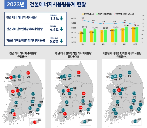 [뉴스서치] 국토교통부는 '23년 전국 모든 건물의 에너지사용량을 집계한 결과, 에너지 총사용량과 단위면적당 에너지사용량이 전년 대비 각각 1.3%, 4.4% 감소했으며, 기준년('18년) 대비 단위면적당 사용량은 9.0% 감소했다고 밝혔다.