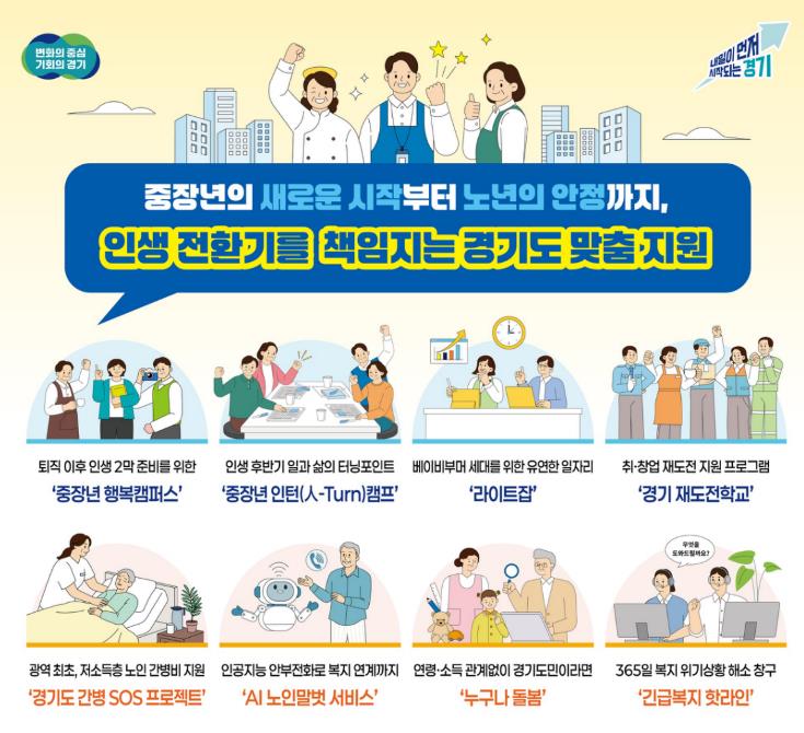 [뉴스서치] 퇴직 이후의 삶을 어떻게 꾸려야 할지 고민하는 중장년부터, 간병과 돌봄 문제로 어려움을 겪는 어르신과 가족까지. 경기도는 올해도 도민이 인생의 전환기에서 새로운 기회를 얻고 안정적으로 생활할 수 있도록 맞춤형 정책을 계속해 나간다.