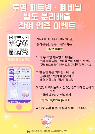 [뉴스서치] 서울 동대문구에서는 고품질 재활용 자원 확보를 위해 ‘투명 페트병‧폐비닐 분리배출 참여 인증 이벤트’를 실시한다.