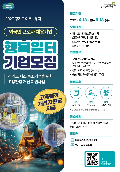 [뉴스서치] 경기도와 경기도일자리재단은 도내 외국인 근로자를 고용한 중소 제조기업을 대상으로 ‘2026년 경기도 이주노동자 행복일터 선정사업’ 참여기업을 모집한다고 20일 밝혔다.