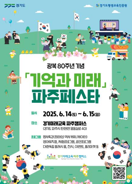 [뉴스서치] 경기도가 주최하고 경기도평생교육진흥원이 주관하는 광복 80주년 기념 ‘기억과 미래’ 파주페스타가 오는 14일과 15일 양일간 경기미래교육 파주캠퍼스에서 열린다.
