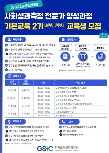 선발된 교육생은 6월 17일부터 4주간 총 24시간의 교육을 이수하게 된다. 남부 권역(20명)은 매주 화요일 군포에서, 북부 권역(20명)은 매주 목요일 의정부에서 진행된다. 주요 교육 내용은 ▲사회문제의 정의와 분석 ▲사회성과 측정 실무 ▲사회성과 진단 등이다.