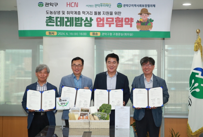 [뉴스서치] 관악구는 지난 6월 19일 HCN, 사단법인 관악뿌리재단, 관악구 지역사회보장협의체와 도농 상생과 취약계층 먹거리 돌봄을 위한 ‘촌데레 밥상’ 업무협약(MOU)을 체결했다.