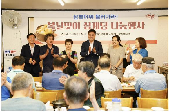 숭인2동은 9일 200여 명의 취약계층 어르신을 초청해 삼계탕을 대접하고 치약 세트를 선물했다. 개인 일정을 고려해 30명은 함께 식사하고 그 외 어르신은 쿠폰을 지급, 원하는 시간대에 식당을 방문하도록 하는 세심함을 보였다.