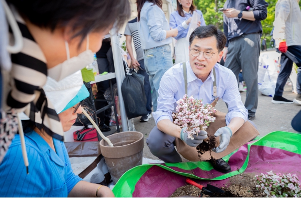 ▲ 지난해 찾아가는 반려식물 관리서비스 현장을 방문해 직접 분갈이에 참여한 이기재 양천구청장