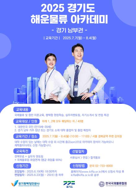 [뉴스서치] 경기도와 경기평택항만공사는 해운·항만·물류 전문인력의 양성을 위해 오는 6월 19일까지 ‘해운물류 아카데미’ 교육생 40명을 모집한다.