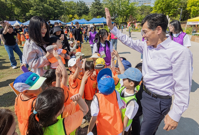 ▲ 어린이 축제에서 지역 아동들과 소통중인 이기재 양천구청장 |