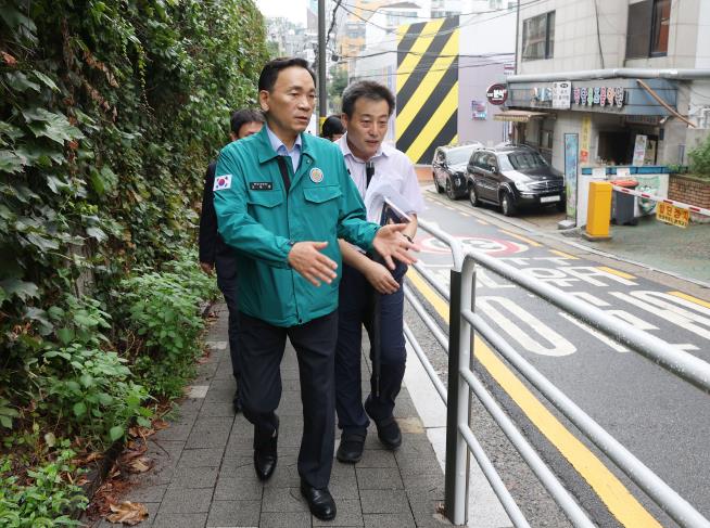 | ▲ 23년 8월 29일 언북초에 조성한 보행도로 점검하는 강남구청장 |