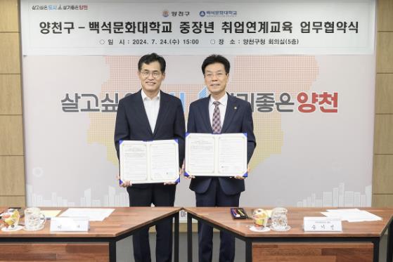 구는 폭넓은 강사진의 전문교육을 통해 중장년층의 실질적 취업을 돕고자 지난달 24일 구청 회의실에서 백석문화대학교와 ‘중장년 취업연계교육 협약’을 체결했다. 채용 수요가 많은 사회복지 분야에서 전문학사 학위 및 사회복지사 자격 취득 기회를 제공한다는 취지다.