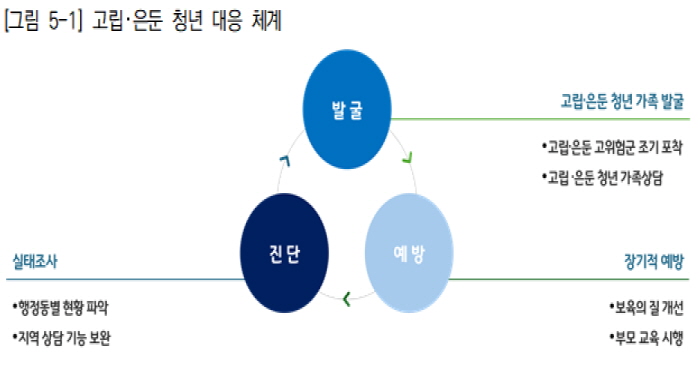 보고서는 현상에 만족하지 못해 일시적으로 외부와 관계를 단절하는 자발적 고립과 생애 전반에 걸쳐 정서적 지지를 얻지 못해 사회화하지 못하는 비자발적 고립을 구분하는 것이 문제 해결의 출발점이라고 말한다. 자발적 고립은 학습 및 훈련 제도를 통해 개선하고, 비자발적 고립은 외부 개입이 적극 요구된다는 것이다. 진단-발굴-예방이라는 복합 대응이 핵심이다.