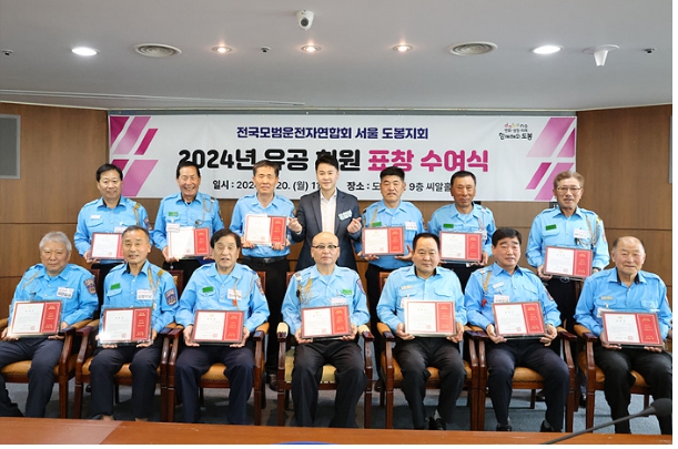 ▲ 2024년 전국모범운전자연합회 서울 도봉지회 유공 회원 표창 수여식 단체 사진 |