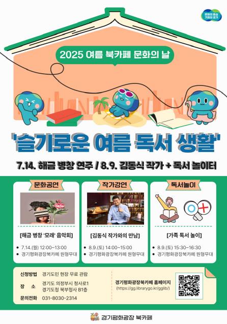 원진희 경기도 행정관리담당관은 “북카페 문화의 날은 도민 누구나 쉽게 접근할 수 있는 문화공간으로 무더운 여름 시원하고 슬기롭게 보낼 수 있는 특별한 시간”이라며 “일상에서 문화를 즐기고 가족과 소통할 기회를 지속 확대하겠다”고 말했다.