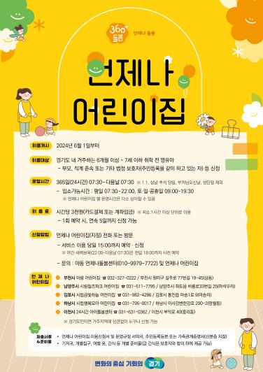 지난 6월 1일 개소한 ‘언제나 어린이집’ 5곳은 아람어린이집(부천시), 시립힐즈파크어린이집(남양주시), 시립금빛하늘어린이집(김포시), 시립행복모아어린이집(하남시), 이천시 24시간 아이돌봄센터(이천시)다. 해당 시군 외 인근 시군에서도 경기도민이면 모두 이용할 수 있어 접근성이 좋은 의정부, 시흥, 광주, 용인, 안산, 구리, 여주, 성남 등에 거주하는 도민들도 편리하게 이용하고 있다.