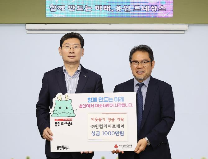 ▲ 이상일 용인특례시장(왼쪽)이 10일 시청 접견실에서 (주)한컴라이프케어 오병진 대표(오른쪽)와 만나 간담회를 가졌다. 이날 오병진 대표는 이웃돕기 성금 1000만원을 용인특례시에 전달했다. |