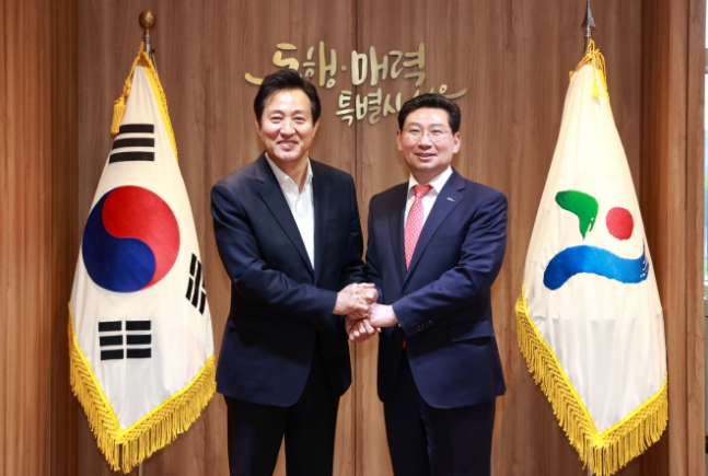 ▲ 2023년 5월 이상일 용인특례시장(우)이 오세훈 서울시장(좌) 간담회 후 기념촬영을 하고 있다 |