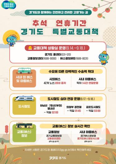 도는 먼저 시외버스의 경우 5개 권역에 42개 노선 89대를 증차하고 운행횟수를 138회 증회한다. 시내·마을버스는 필요시 시군 자체 실정에 맞춰 1시간 연장 운행 등 탄력적으로 운영한다. 도시철도는 하남선과 7호선(부천 구간), 별내선은 9월 17일부터 18일까지 2일간 익일 오전 2시까지, 의정부 경전철은 익일 오전 1시 45분까지, 김포도시철도는 익일 오전 3시까지 심야 연장 운행한다.